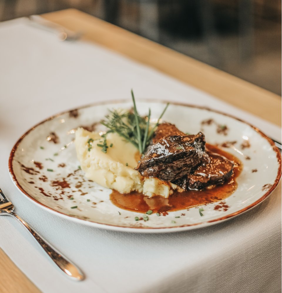 Danie główne: Polędwiczka w sosie myśliwskim, puree z ziemniaków
